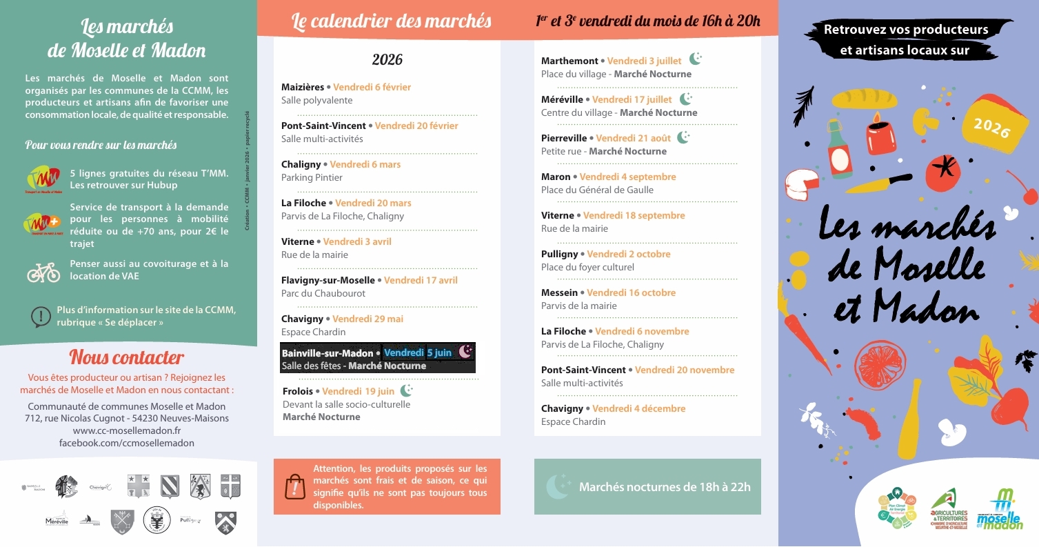 Marchés de Moselle et Madon 2026 Auteur/autrice de la publication :Mairie de Bainville Publication publiée :27 janvier 2026 Post category:Animations / Marché de producteurs Commentaires de la publication :0 commentaire Voilà le dépliant des marchés de la CCMM avec les dates et les producteurs. Pour Bainville, ce sera le vendredi 5 juin de 18h à 22h. Vous devriez également aimer Luthopie au marché de la CCMM à Bainville-sur-Madon, le 3 octobre 2025 23 septembre 2025 Retrouvez Les Malices à Malou au marché de la CCMM à Bainville-sur-Madon, le 3 octobre 2025 26 septembre 2025 Les 110 ans… de la Grande Guerre (10-11 novembre 2024) ! 25 octobre 2024 Laisser un commentaire Annuler la réponseCommentEnter your name or username to comment Enter your email address to comment Saisir l’URL de votre site (facultatif) Δ