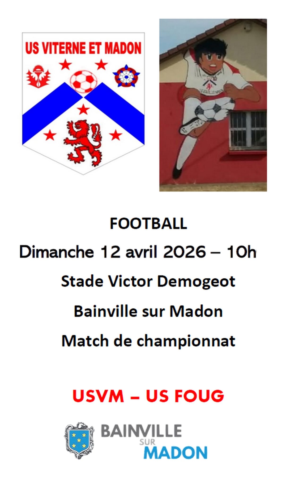 Match de football (12 avril 2026) Auteur/autrice de la publication :Mairie de Bainville Publication publiée :7 avril 2026 Post category:Animations / Sport Commentaires de la publication :0 commentaire Vous devriez également aimer Fort Pélissier, la réouverture ! 12 mai 2021 Cérémonie du 11 novembre 2021 7 novembre 2021 Jacques Callot à l’honneur (3-4 septembre 2022) 23 août 2022 Laisser un commentaire Annuler la réponseCommentEnter your name or username to comment Enter your email address to comment Saisir l’URL de votre site (facultatif) Δ