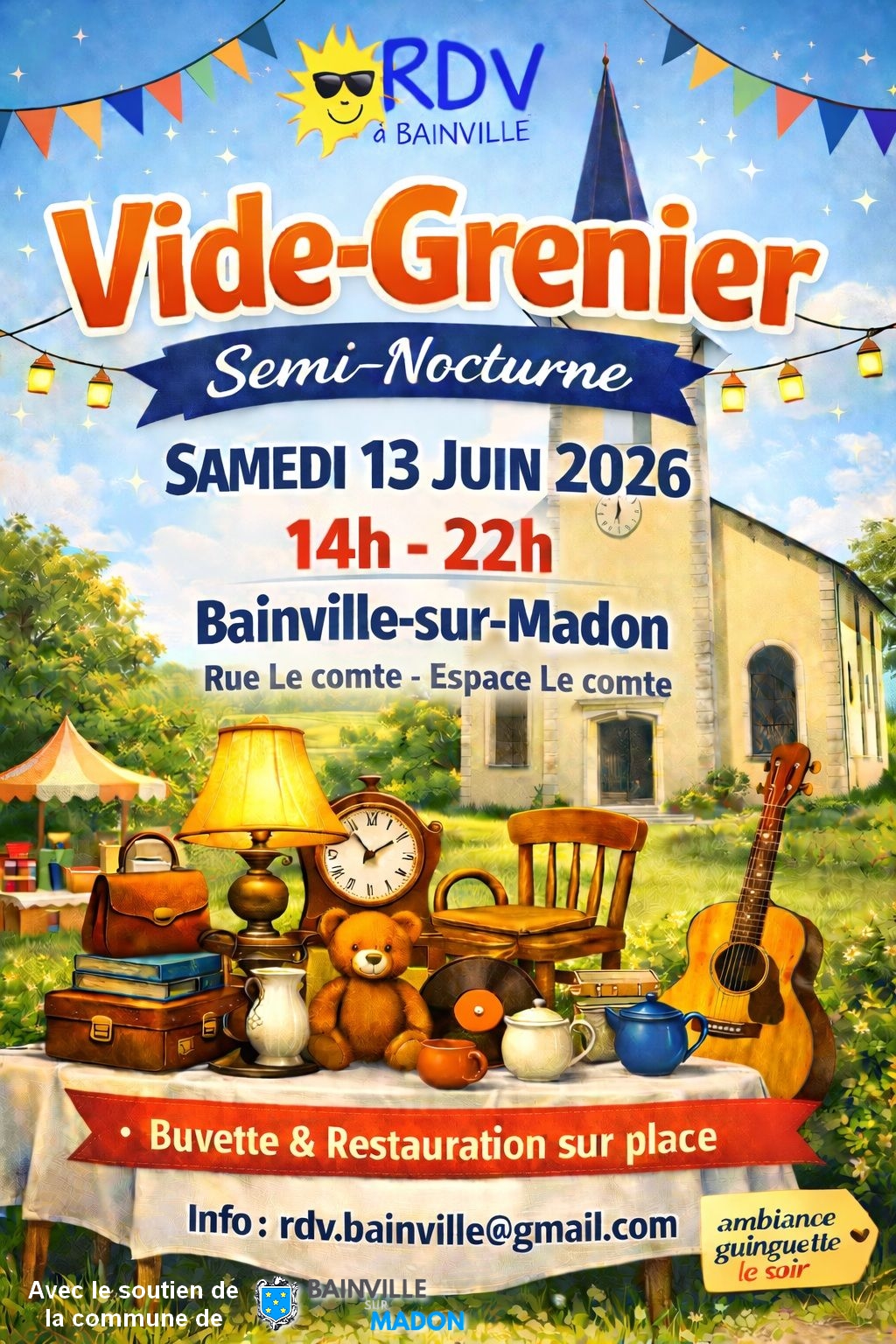 Vide-grenier de RDV à Bainville (13 juin 2026) Auteur/autrice de la publication :Mairie de Bainville Publication publiée :14 avril 2026 Post category:Animations / Vide-Grenier Commentaires de la publication :0 commentaire Vous devriez également aimer Les enfants de l’école de Bainville invités au spectacle de Chantal Goya ! 6 octobre 2021 Téléthon 2023 4 décembre 2023 Fort Pélissier : programme du week-end (7,8,9 août) 7 août 2020 Laisser un commentaire Annuler la réponseCommentEnter your name or username to comment Enter your email address to comment Saisir l’URL de votre site (facultatif) Δ