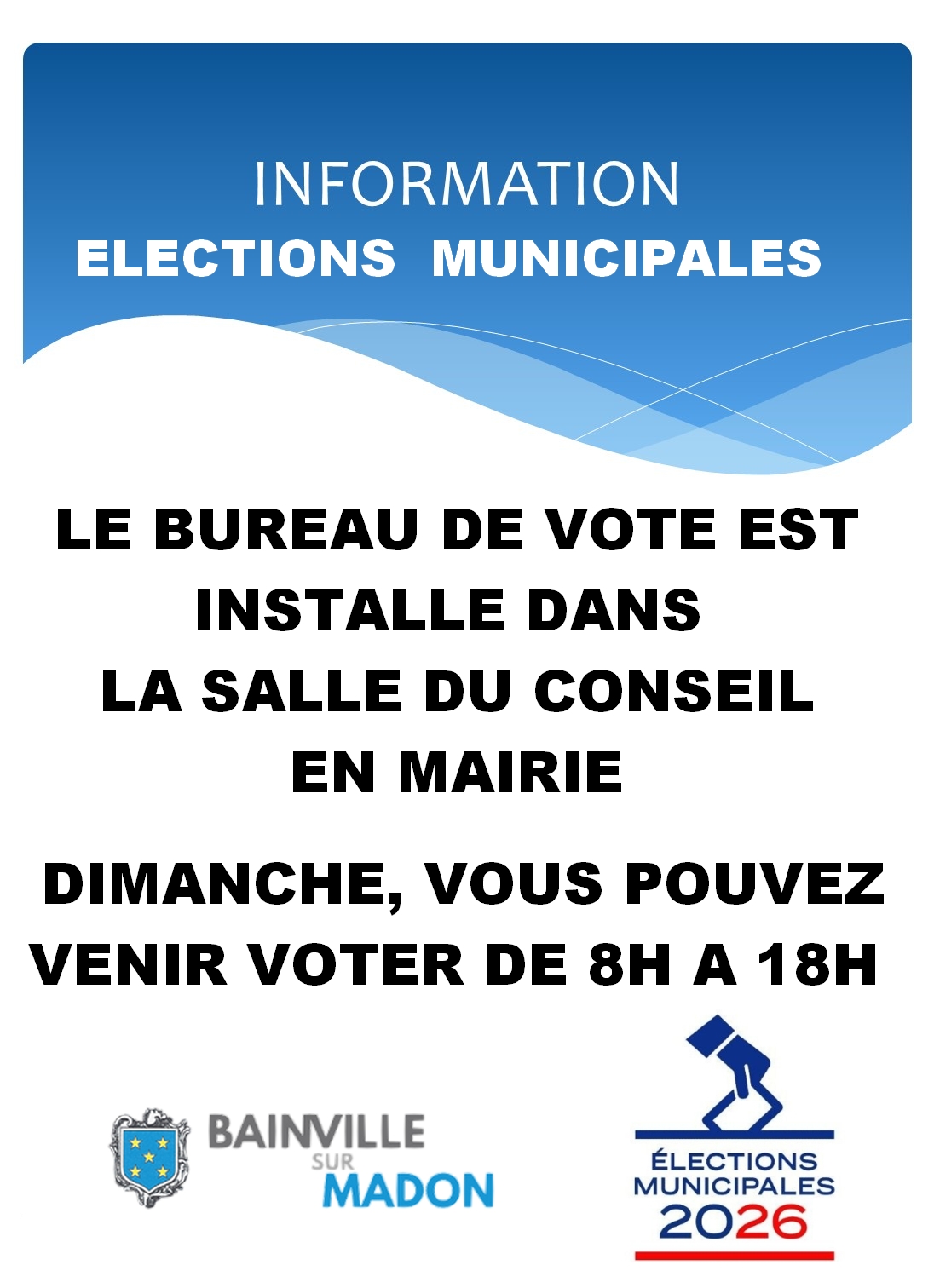 Elections municipales 2026 : le bureau de vote en mairie (8h-18h) Auteur/autrice de la publication :Mairie de Bainville Publication publiée :14 mars 2026 Post category:Election / Elections municipales Commentaires de la publication :0 commentaire Vous devriez également aimer Composition de la commission de contrôle des listes électorales 2ème période 2023-2026 13 février 2026 Elections : pensez à vous inscrire sur les listes électorales ! 3 novembre 2025 Election des membres de la chambre d’agriculture de Meurthe-et-Moselle du 31 janvier 2025 27 novembre 2024 Laisser un commentaire Annuler la réponseCommentEnter your name or username to comment Enter your email address to comment Saisir l’URL de votre site (facultatif) Δ